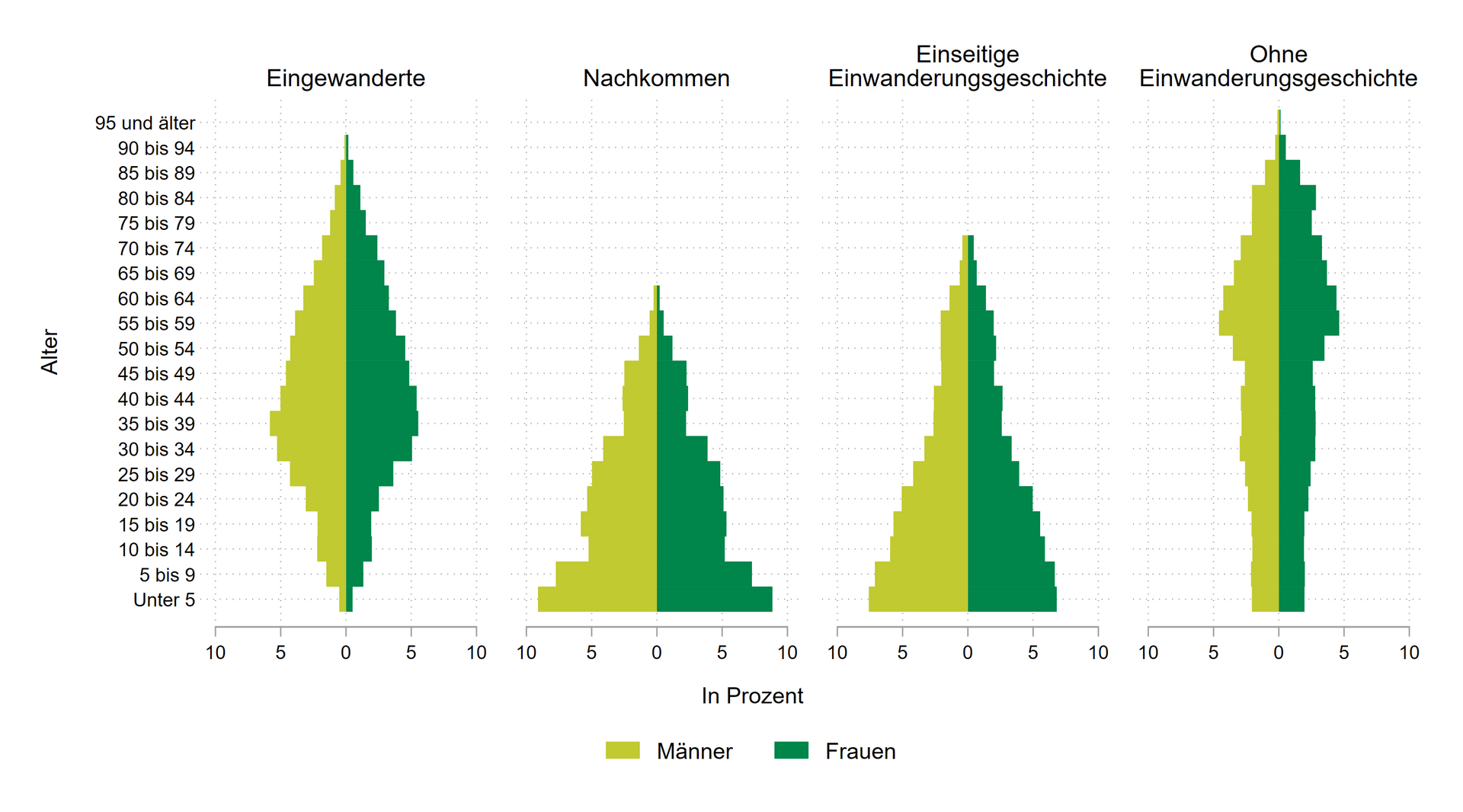 Insgesamt unterscheidet sich der Anteil von Frauen und Männern unter Eingewanderten, Nachkommen und Personen mit einseitiger Einwanderungsgeschichte kaum von dem unter Personen ohne Einwanderungsgeschichte. Er ist über alle Gruppen hinweg weitgehend ausgeglichen: 50,1 % der Eingewanderten, 48,5 % der Nachkommen, 49,1 % der Personen mit einseitiger Einwanderungsgeschichte und 51 % der Personen ohne Einwanderungsgeschichte sind Frauen.