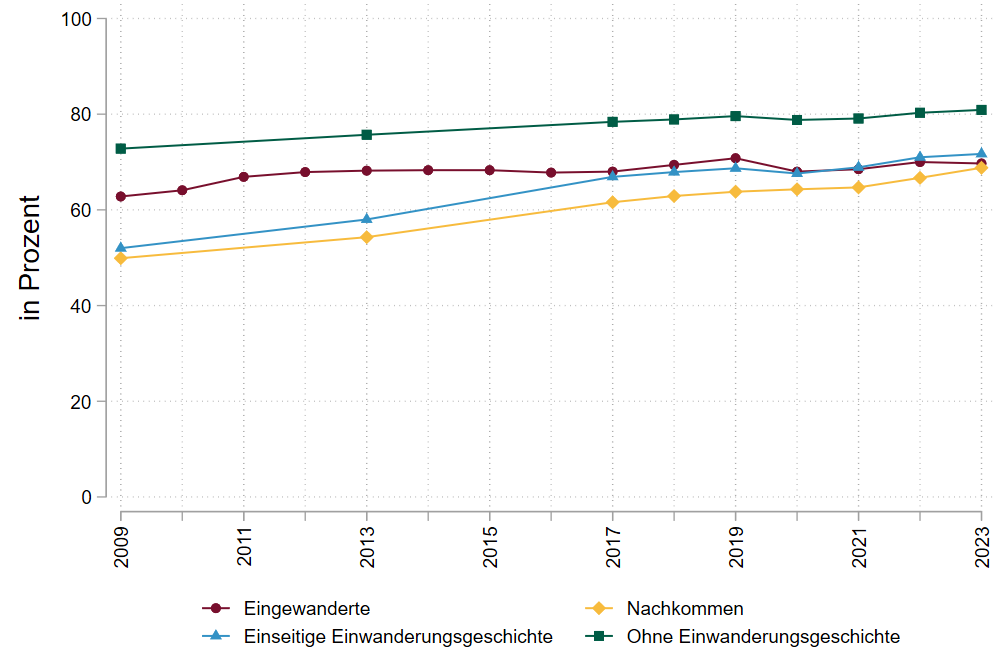 Abbildung 1: Erwerbstätigenquote der 15- bis 64-Jährigen nach Einwanderungsgeschichte (2005–2023)