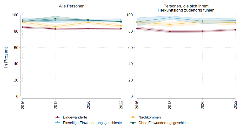 Abbildung 2.2: Zugehörigkeitsgefühl zu Deutschland für alle Personen und ausschließlich für Personen, die sich dem Herkunftsland zugehörig fühlen, nach Einwanderungsgeschichte (2016–2022)