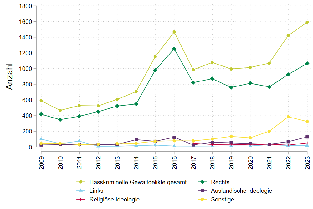 Abbildung 3: Amtlich registrierte Fälle von hasskrimineller Gewalt nach Phänomenbereich8 (2009-2023)