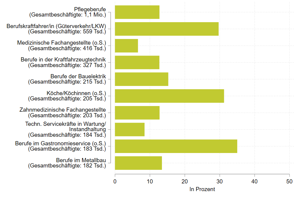 Abbildung 4: Anteil der Beschäftigten ohne deutsche Staatsangehörigkeit in den zehn beschäftigungsstärksten Engpassberufen auf Anforderungsniveau Fachkraft (2023)