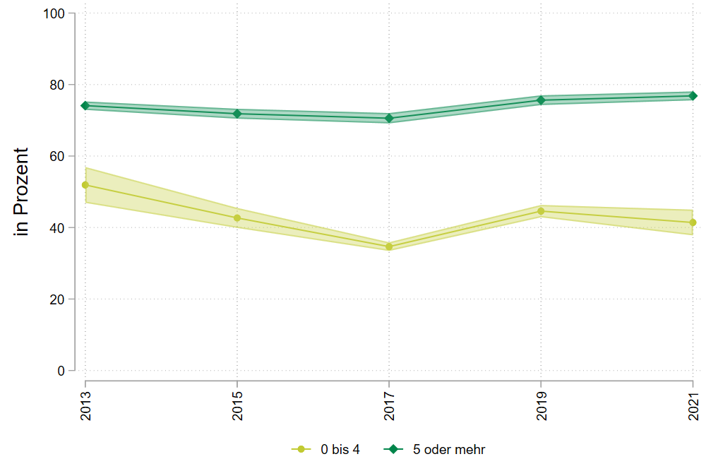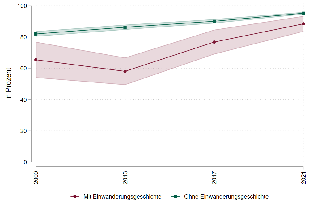 Anmerkung: Diese Werte beruhen auf der Nachwahl-Befragung der German Longitudinal Election Study. Leider lassen Befragungsdaten keine direkten Schlüsse auf die tatsächliche Wahlbeteiligung zu. Aufgrund sozialer Erwünschtheit geben in Befragungen häufig mehr Befragte an, an Wahlen teilgenommen zu haben als der amtlichen Wahlstatistik zufolge der Fall ist. Unter der Annahme, dass die Überschätzung der Wahlbeteiligung Personen mit und ohne Einwanderungsgeschichte gleichermaßen betrifft, können die Wahlbeteiligungsraten beider Gruppen miteinander verglichen werden.