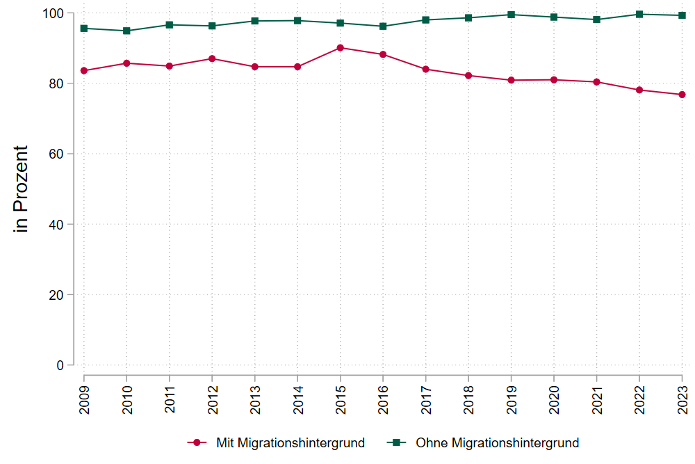 Abbildung 6: Betreuungsquote der 3- bis unter-6-Jährigen nach Migrationshintergrund (2009–2023)