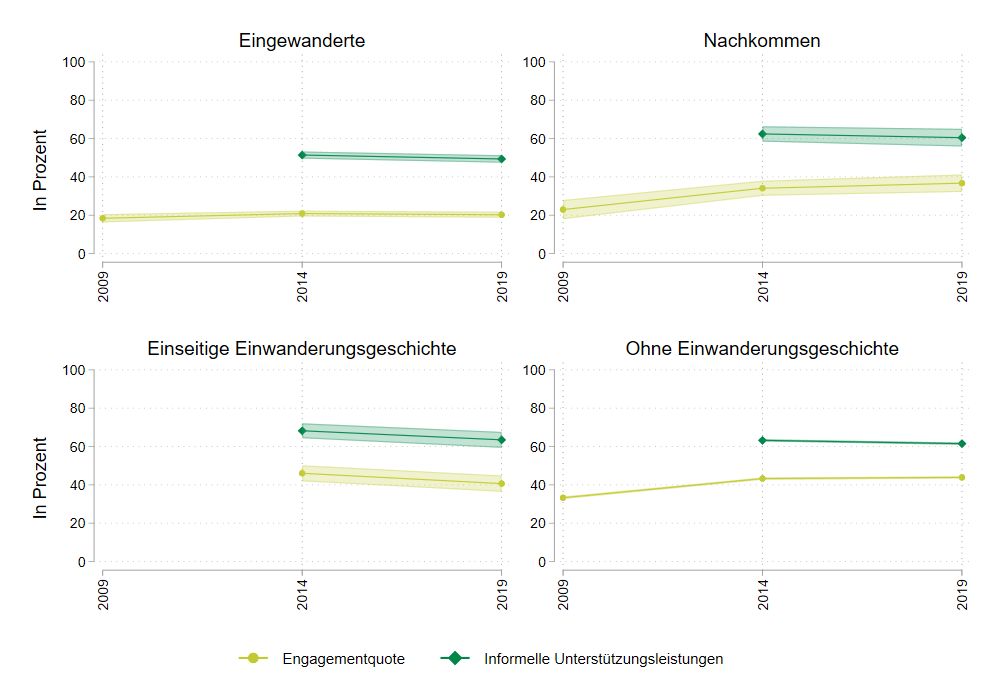 Im Jahr 2019 leisten zudem etwa die Hälfte aller Eingewanderten informelle Unterstützungsleistungen (49,4 %). Demgegenüber liegt der Anteil bei ihren Nachkommen (60,5 %) und bei Personen mit einseitiger Einwanderungsgeschichte (63,5 %) auf dem Niveau von Personen ohne Einwanderungsgeschichte (61,5 %).