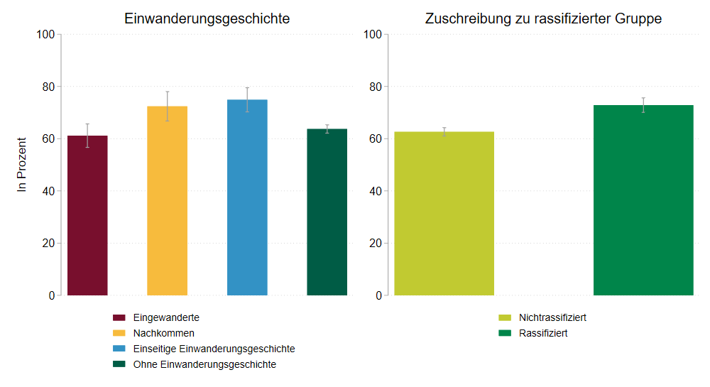 Rund 90 % der Bevölkerung erkennt an, dass es Rassismus in Deutschland gibt.18 Obwohl Rassismus auf institutioneller Ebene meist schwieriger zu erkennen ist als auf individueller Ebene,19 geben auch etwa 65 % der Gesamtbevölkerung an, dass es rassistische Diskriminierung in deutschen Behörden gibt.20 Diese Wahrnehmung von Rassismus ist besonders ausgeprägt unter Personen mit ein oder zwei eingewanderten Elternteilen, sowie unter rassifizierten Personen, sprich Personen, die von Außenstehenden als Angehörige einer rassifizierten Gruppe wahrgenommen werden. Jedoch stimmen auch 63,6 % der Personen ohne Einwanderungsgeschichte und 62,6 % der nichtrassifizierten Personen zu, dass es rassistische Diskriminierung in Behörden gibt. Dies legt nahe, dass es für viele Menschen keine eigenen rassistischen Diskriminierungserfahrungen bedarf, um sich des Problems Rassismus bewusst zu werden.