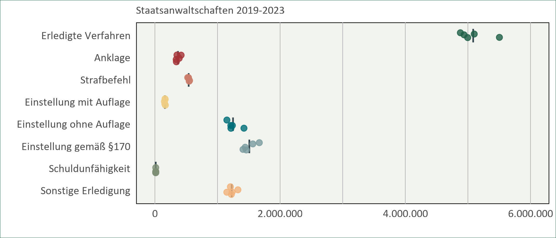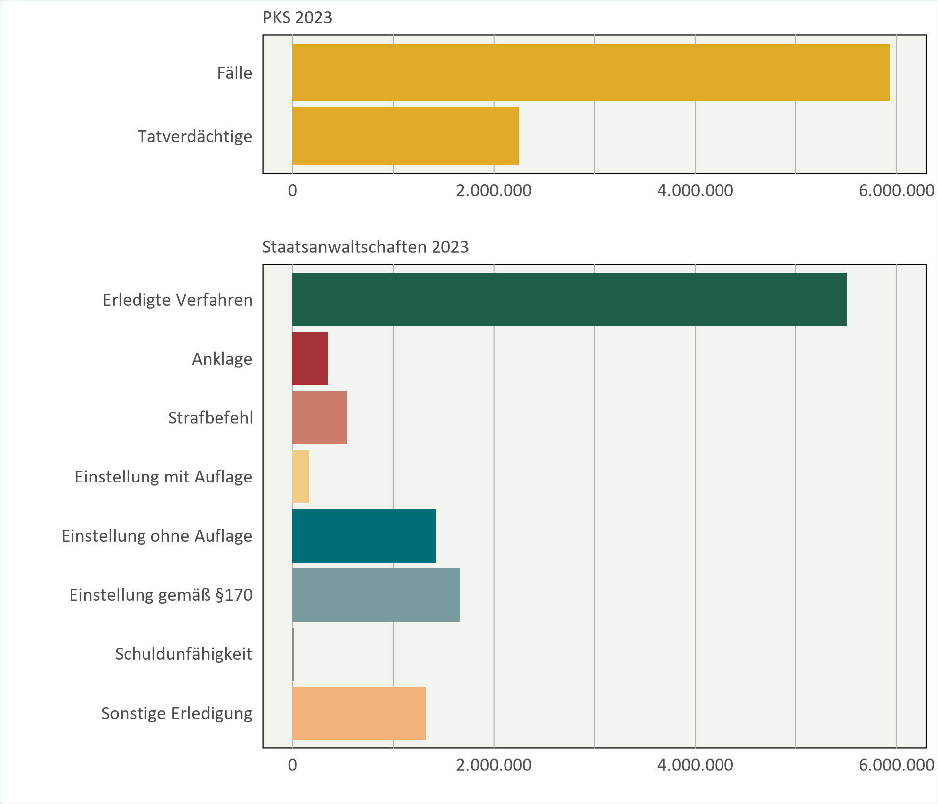 Die 5,5 Millionen von den Staatsanwaltschaften erledigten Verfahren entsprechen in etwa der Zahl der Fälle aus der PKS. Im Vergleich zu fast sechs Millionen Fällen in der PKS wurden 2023 aber nur etwa 350.000 Fälle einem Gericht vorgelegt beziehungsweise in knapp 540.000 Verfahren direkt ein Strafbefehl ausgesprochen. Zusammen mit den Einstellungen mit Auflagen wurden 2023 also nur gut eine Million Fälle direkt weiterverfolgt.